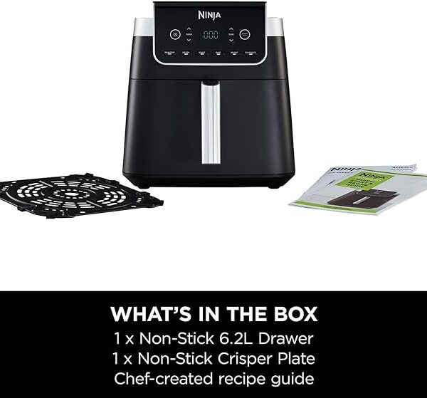 - INCLUDES: Ninja Single Drawer Air Fryer, Non-stick, dishwasher-safe 6.2L Basket & Adjustable Crisper Plate. Chef-Created Recipe Guide. Colour: Grey.